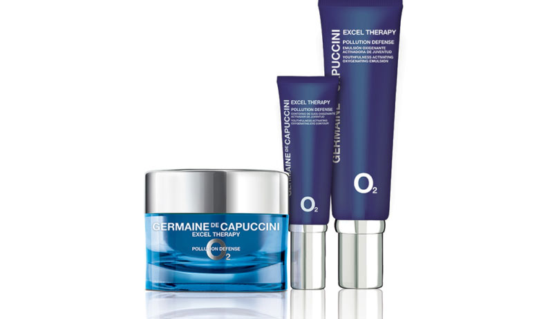 Germaine de Capuccini stworzyła linię EXCEL THERAPY O2, który zawiera mieszaninę kompatybilnych z naskórkiem polisacharydów stanowiąc fizyczną barierę dla cząstek PM 2,5. Ponadto pełni rolę filtra chroniącego skórę przed promieniowaniem emitowanym przez komputery, smartfony czy tablety ( niebieskie światło widzialne – HEV). Produkty tej linii posiadają także w swym składzie wysokiej mocy antyoksydanty oraz nowoczesny składnik – cytokiny, usprawniające komunikację międzykomórkową i wzmacniające procesy regeneracyjne. Dodatkowym atutem tych produktów jest także biotechnologiczny składnik Life Cytogen – tlen zamknięty w specjalnych kapsułkach, które transportują go do wnętrza komórek. Kapsułki zbudowane są z ceramidów które uzupełniają braki lipidów w cemencie międzykomórkowym, co jest niewątpliw ą zaletą gdyż ułatwia zregenerować naskórek po zimie.